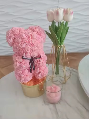 El Oso Amoroso es mucho más que un regalo, es una muestra de amor que perdura en el tiempo. Cada oso está elaborado a mano con cuidadosas rosas eternas, pétalo a pétalo, logrando un diseño elegante y lleno de ternura.